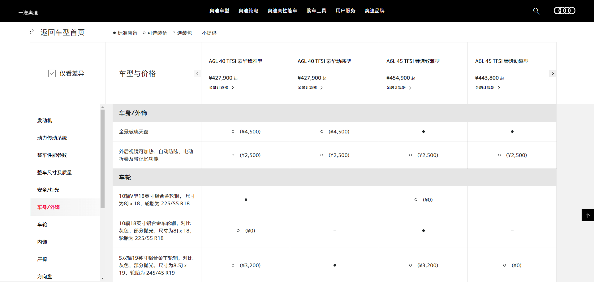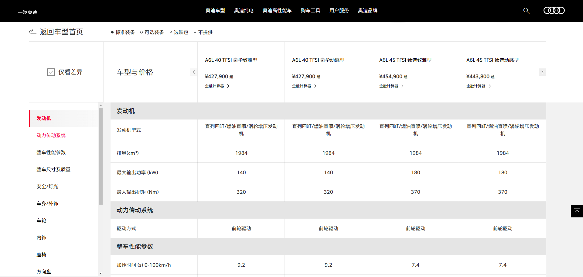 3. Clicking "仅看差异" hides options with identical values in the categorized attributes.