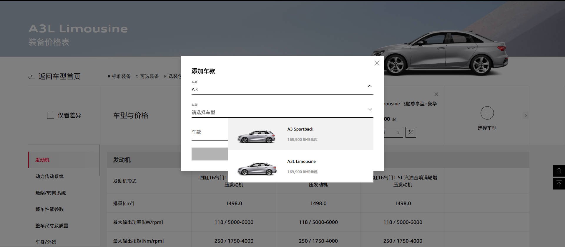 a. Cross-Model Comparison: Users can add different car models by clicking the “+” to compare their parameters.