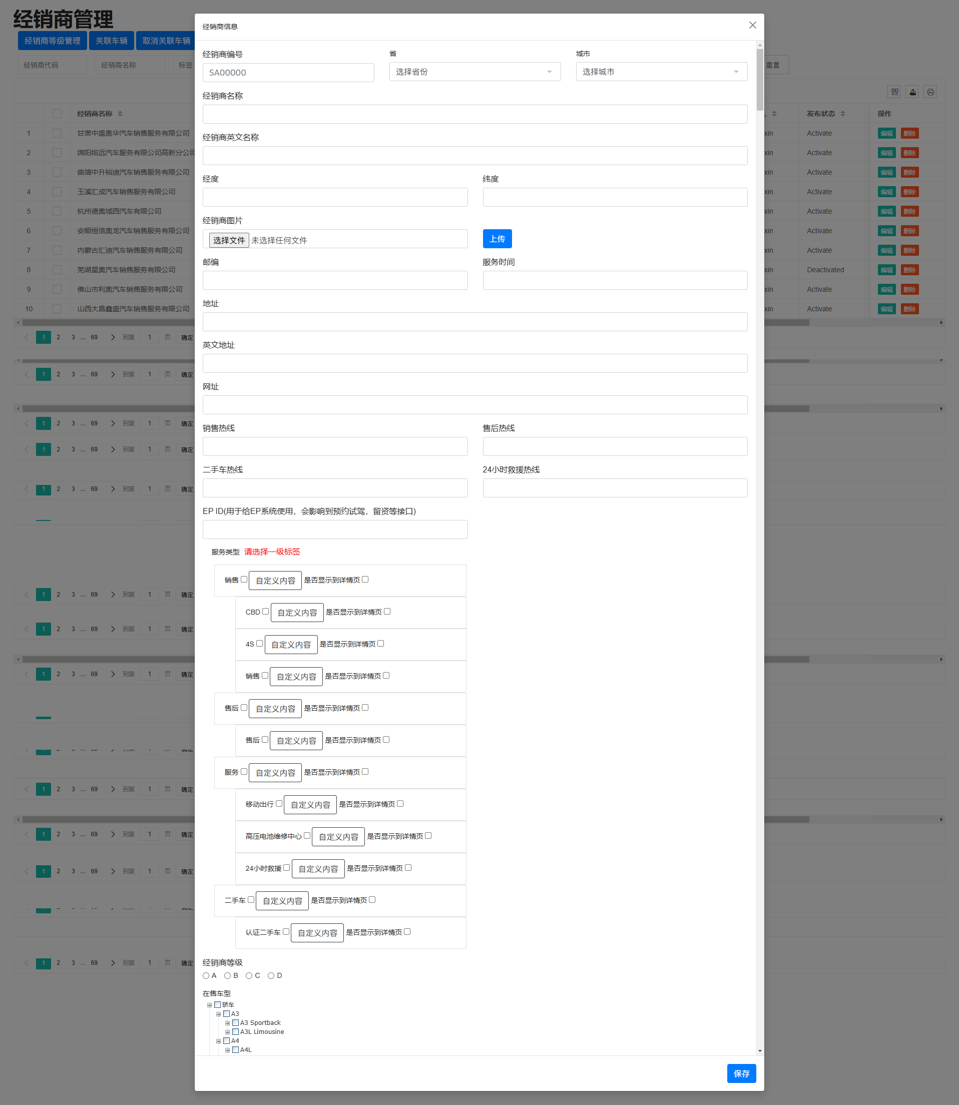 b. Additional information, such as dealer code, English name, address, website, various service numbers, quick tags, and dealer level, can be filled in.